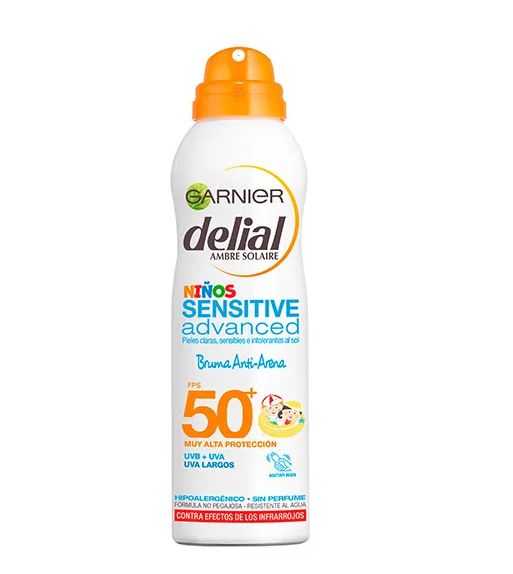 Este producto es el que ha recibido la nota más alta de la OCU, que destaca su elevado SFF de 50+ y su protección contra los rayos UVB y UVA. Además se vende en formato aerosol que dispensa el producto en forma de bruma, por lo que la aplicación es fácil y sencilla, especialmente para los niños. Otras características reseñables es que es hipoalergénica y repele la arena del cuerpo (que de nuevo, lo convierte en un producto ideal para niños) y es resistente al agua, por lo que la piel sigue protegida incluso durante el baño. El precio habitual ronda los 12€
