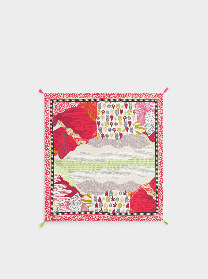 Un diseño llamativo en el que predominan los tonos rojos, totalmente cuadrado y con unas dimensiones perfectas para usarlo para cubrir la zona del cuello o para adornar una coleta. Sus cuatro esquinas están adornadas con unas pequeñas borlas de colores.