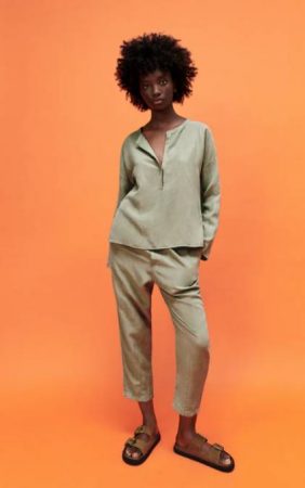 La parte de arriba es una blusa de cuello redondo con manga larga y escoge de pico. La parte de abajo es un pantalón de tiro medio con cintura elástica ajustable, con bolsillos laterales de plastrón y detalle de pliegues en la zona delantera. Ambas prendas con un bonito color verdoso.