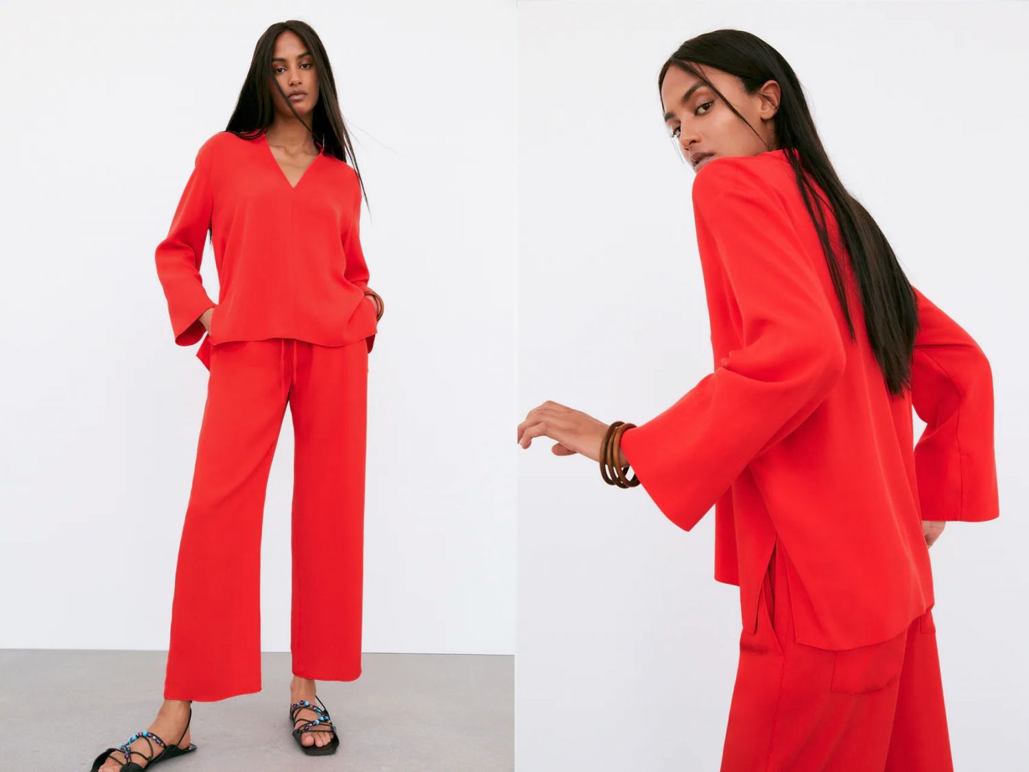 Esta blusa fluida con aberturas de Zara cuesta 29,99€ y está disponible en este tono rojo coral tan llamativo, además de varias tallas.