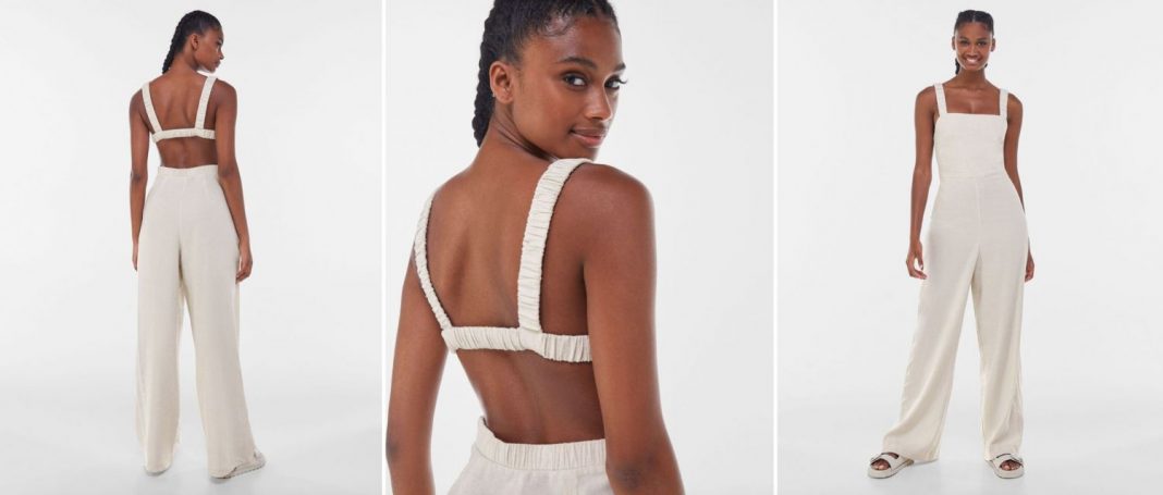 Una opción perfecta para las noches de verano que podrás combinar fácilmente con unas sandalias de tacón y con los complementos mas llamativos. Su composición está formada por viscosa, algodón y lino. Esta confeccionado con tirantes fruncidos para que se ajusten a cada cuerpo. La espalda, sin tener en cuenta los tirantes, queda completamente al aire dando un efecto más elegante, pero también puedes llevarlo con una camiseta básica debajo tipo peto con unas deportivas consiguiendo un look más casual. El pantalón tiene otro fruncido en la zona trasera para que se ajuste a la figura. Esta disponible en 5 tallas, comprendidas entre la XS y la XL, y su precio es de 29,99 €.