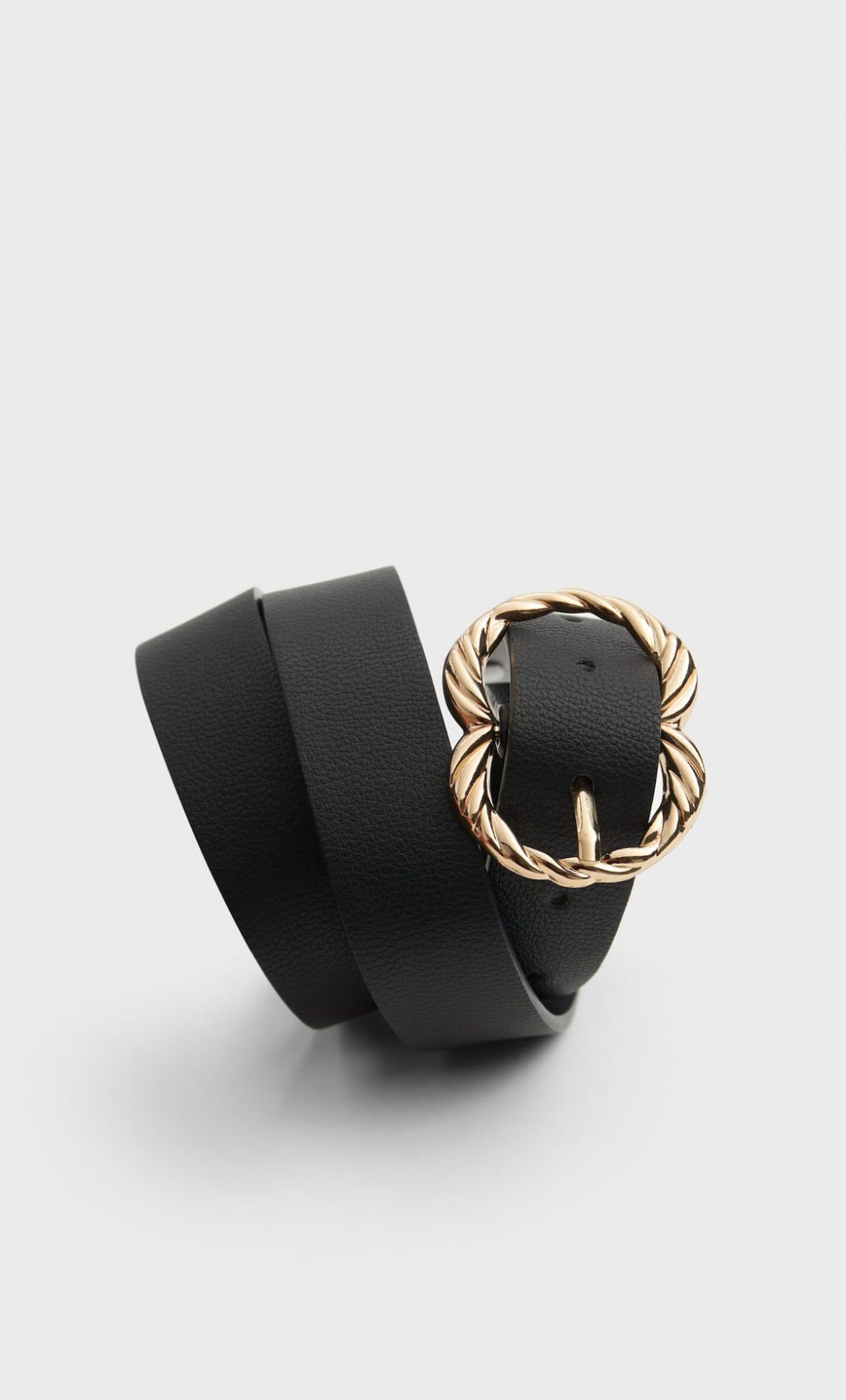 Stradivarius trae este modelo, algo clásico pero llamativo. Este cinturón de hebilla labrada, viene en color negro, elaborado de tal forma que su textura pareciera realmente piel. La hebilla labrada le da un toque único de elegancia y lo hace mucho más atractivo. Puedes usarlo con cualquier pieza de vestir, pero se verá más atractivos en unos Jean o en pantalones vaqueros y por qué no en un buen short, donde luzcas tus atractivas piernas. Lo conseguirás en cualquiera de sus tiendas por tan solo 7.99 euros.