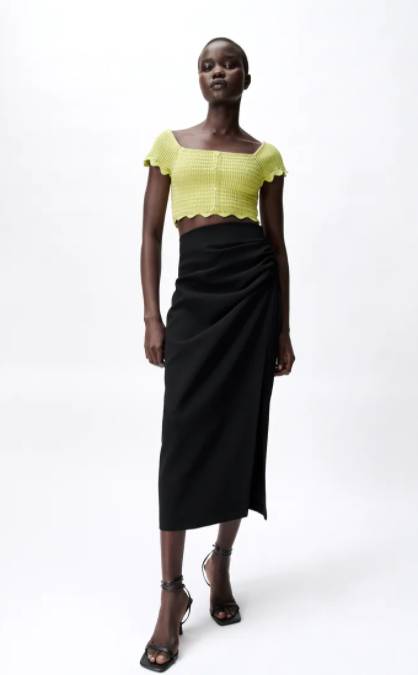 Este modelo que te destacamos es de tiro alto y tiene un detalle de drapeado o pliegues en el lateral que la hacen diferenciarse de las faldas de tubo más clásicas. Además, el cierre queda totalmente oculto en la costura. Y para que sea todavía más cómoda, se le ha añadido una abertura en el bajo para facilitar la libertad de movimientos.