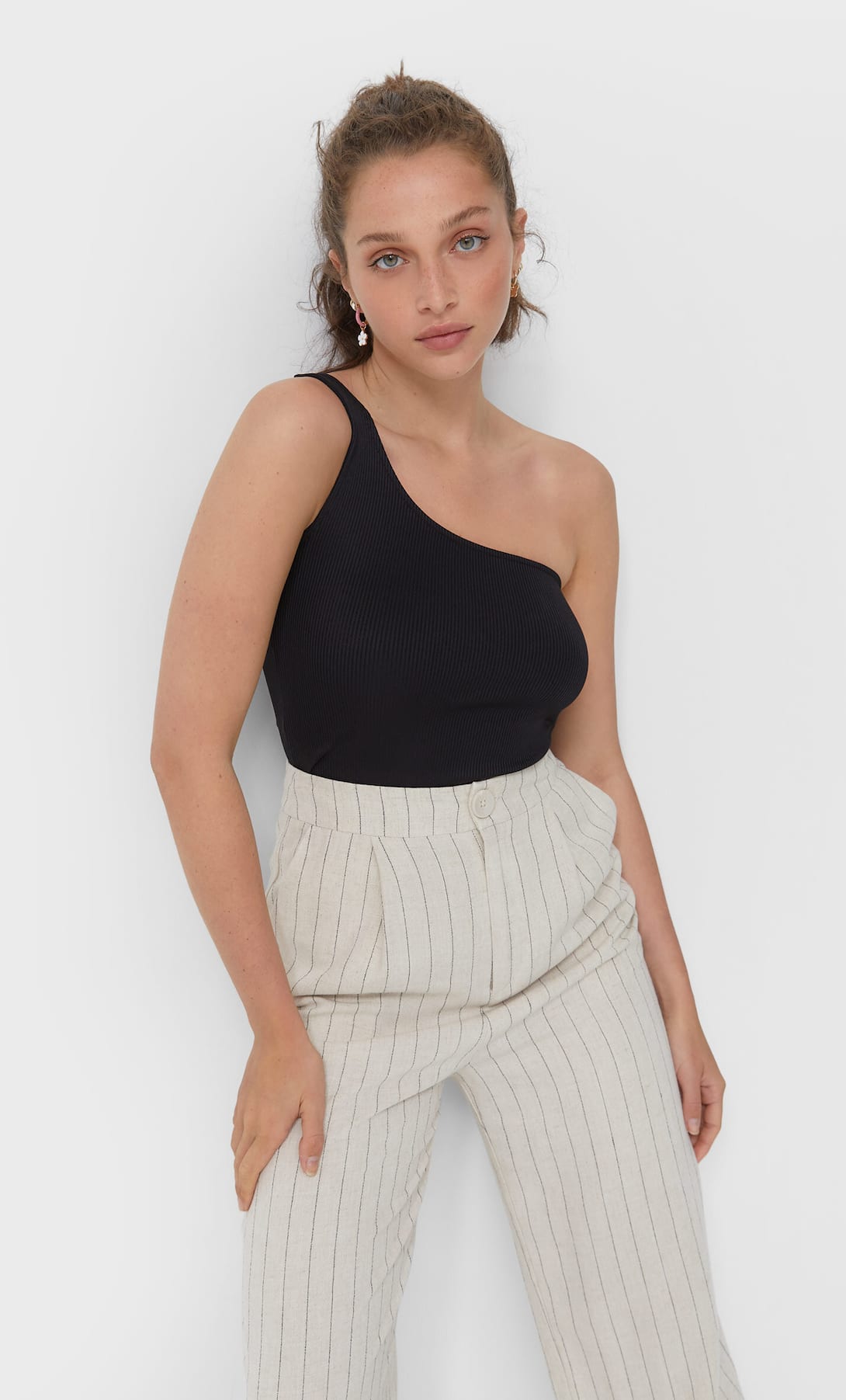 Las prendas asimétricas nunca pasan de moda, ya que son un recurso sencillo para aportar un toque de sofisticación al look más básico. Con una sola prenda se le puede dar un aspecto mucho más llamativo a cualquier outfit. Apúntate a la moda de las asimetrías con este top básico de Stradivarius, con un solo tirante y ligeramente corto, en tonos lisos, disponible en rojo, negro, blanco y beige.