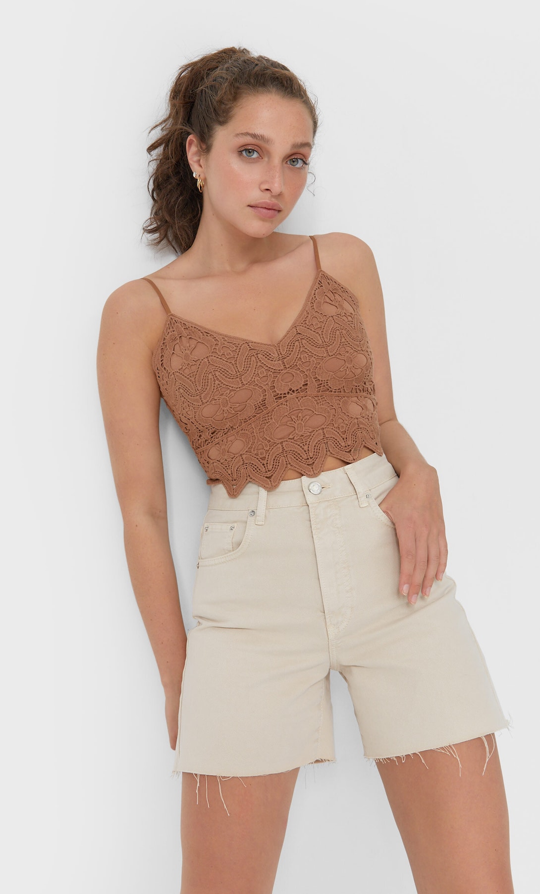 El encaje ha cobrado un gran protagonismo en las últimas temporadas y por eso no podía faltar en la nueva colección de tops de Stradivarius. Uno de los preferidos de la temporada está siendo este precioso modelo confeccionado con un tipo de encaje conocido como guipur, que tradicionalmente se hace con un sistema de bolillos. El corte es tipo crop, con tirantes muy finos y un escote de pico.