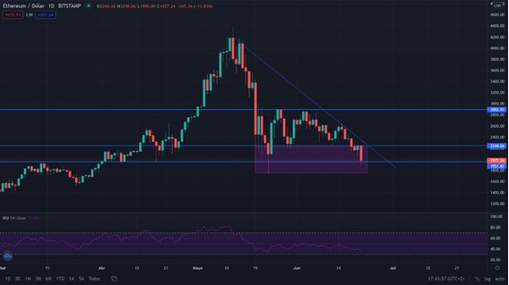 En el gráfico diario, Ethereum se encuentra en tendencia bajista, desde su máximo de 4400 con una caída cerca del 50%. Durante varias semanas Eth se ha movido en un canal lateral entre los 2900 y 2250. La actual vela se encuentra por debajo de dicho soporte tocando los 1950.