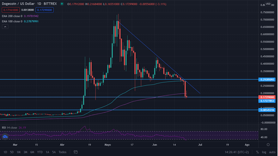 Analizando técnicamente Doge, en el gráfico diario ha roto todos los soportes de los últimos dos meses. Desde su máximo en 0.73 ha caído por debajo del soporte 0.29. De continuar la tendencia, si no recupera la media de 200, irá camino al siguiente soporte más fuerte en los 0.08, el cual continuó toda la gran subida de los últimos meses. Tras atravesar la media de 100 en el día de ayer, ha caído hasta la media de 200, en el nivel 0.16. En el corto plazo, si Doge se acerca y respeta la línea de tendencia bajista, podríamos efectuar ventas hasta el nivel 0.16 actual mínimo. De cara a medio plazo, dada la alta volatilidad y especulación que hay actualmente con Doge, debemos estar expectantes, ya que cualquier dirección en el precio puede verse alterada con movimientos muy fuertes.