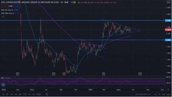 A nivel técnico, en grafico diario IAG se encuentra en el nivel 2.32 euros por acción formando máximos decrecientes y mínimos crecientes, creando así un banderín. Teniendo en cuenta su crecimiento, para el corto plazo veríamos romper dicho banderín y continuar alcista hasta la resistencia de los 2.60 euros por acción. Incluso, de atravesar dicha resistencia, sería un nuevo máximo para IAG desde su mínimo tras la cuarentena, máximo que se dio en junio del 2020. Anteriormente, durante los meses de noviembre a febrero IAG tuvo una formación de bandera, por lo que cabe la posibilidad de ver repetido dicho patrón alcista nuevamente. En el medio y largo plazo IAG se encontraría en una tendencia alcista, a la espera de superar el nivel de los 2.60 euros por acción; de ser así IAG podría llegar al nivel de 3 euros por acción, equiparando niveles de agosto del 2019.