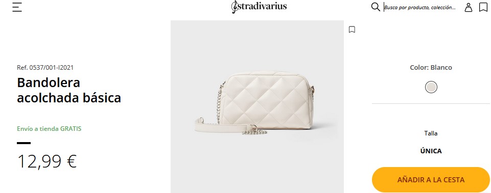 Esta hermosa bandolera de color blanca, cuenta con unos hermosos detalles acolchados en toda parte. Además, cuenta con una cadena para darle el toque único al bolso y un poco más elegante. Por lo que, otro de los productos de Stradivarius preferidos por las mujeres en esta temporada. Son fabricados en la parte exterior en 100% de poliuretano, por lo que no se debe lavar, inclusive no usar lejía ni blanqueador. Menos se debe planchar, no limpiar en seco y no usar secadora. Entonces, adquiere esta hermosa bandolera por Stradivarius a un precio accesible de 12,99 €.
