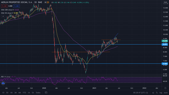 Actualmente el precio se encuentra por encima de la media de 200 y 50 períodos, formando un canal entre los 9.30 la línea de tendencia y el soporte de los 8.85. A corto plazo, veríamos el precio continuar en dicho canal. En el medio plazo, si continuamos con la tendencia alcista y el rechazo a la media de 50, veríamos el precio pasar la resistencia de los 9.30 para tocar nuevamente la línea de tendencia. Además, teniendo en cuenta la tendencia alcista y la situación de mejora, a medio-largo plazo podríamos ver el precio de la acción de MLR continuar su recuperación y así lograr el punto anterior a la pandemia.