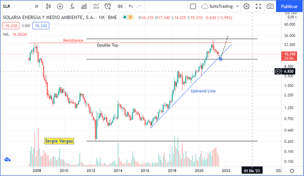 Ahora bien, con relación a la estructura técnica del precio actual de SOLARIA vamos entonces a analizar varios puntos. El primero es que en este momento el precio está realizando lo que conocemos como un doble top, esto no significa en términos de probabilidad estadística que ya tengamos que vender y menos cuando la tendencia desde 2016 a sido alcista y sostenida.