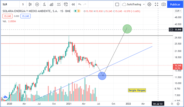 Por otro lado, si el precio llegase a quebrar los 11,5 euros tendríamos una muy rápida caída a niveles cercanos a 6.8 euros por acción lo cual no tiene la mayor probabilidad dadas las condiciones propias del mercado y del sector especifico a menos que volvamos a tener incrementos en impuestos para empresas y usuarios finales de energía fotovoltaica como los asumidos en años pasados que afectaron el sector.