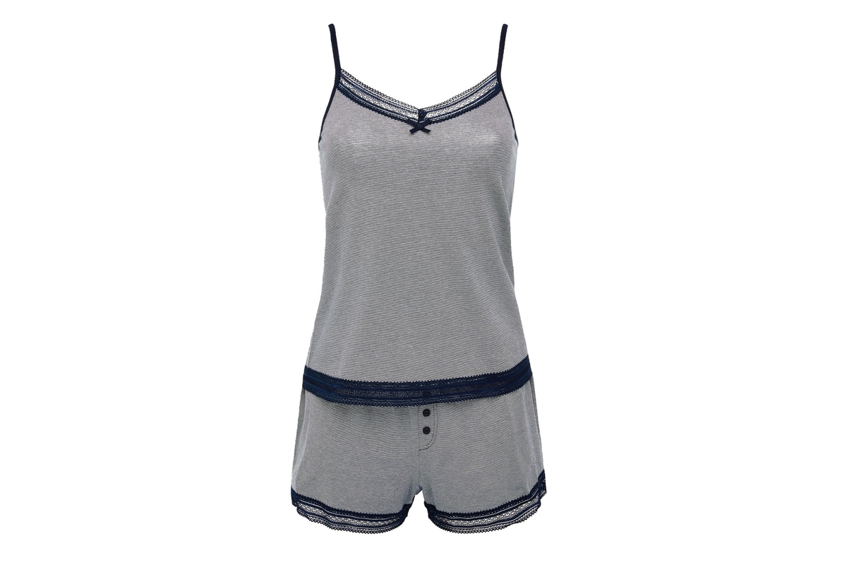 Es una prenda de algodón, con rayas en color gris mezcla, así como detalles calados en las costuras de la cintura, pecho, y piernas. Incluye varios botones frontales en su pantalón costura, detalle de lazo azul en el escote, y tirantes finos. Una buena alternativa con un toque más juvenil si no te gustan los pijamas de raso.