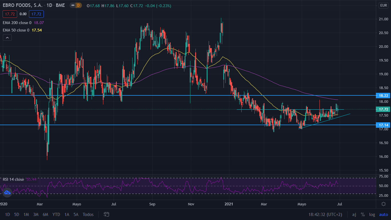 En cuanto a técnico, desde el inicio de su tendencia bajista en agosto del pasado año, Ebro Foods tuvo subidas fuertes pero que no llevaron al precio a cambiar su dirección bajista. En el mes de marzo encontró soporte en el nivel 17,14, saliendo así de la tendencia bajista y pasando a formar un canal lateral con zona 17,72 que está actualmente perforando. En los últimos dos meses, el precio se encuentra formando mínimos crecientes indicando presión alcista que llevaría lo llevaría en un corto plazo a superar dicho nivel. De ser así, para un medio plazo, veríamos el precio llegar a la siguiente resistencia situada en los 18,22. Teniendo en cuenta los resultados del primer trimestre, apunta a tendencia alcista para los próximos meses.