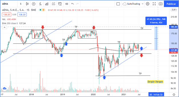 No obstante, como siempre lo mencionamos, por contraparte, podemos encontrar retrocesos y un retroceso que quiebre la media móvil de 250 periodos a la baja y al mismo tiempo quiebre ese nivel de 130 euros por acción que nos sirve de soporte y posterior resistencia para ventas a buscar niveles de 100 euros por acción. No lo vemos en este momento con tendencia bajista, no vemos que tenga fuerza para quebrar la última directriz alcista y vemos que el precio tiene potencial de respetar esa media móvil de 250 periodos y, por ende, ir a buscar esos imanes de los targets en niveles de 180 euros por acción. Adicional a esto, debemos prever que Aena, dentro de su mercado, ya está volviendo a coger un ritmo previo al de la pandemia.