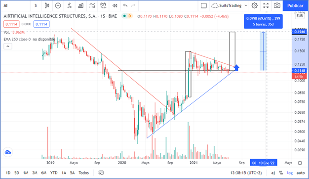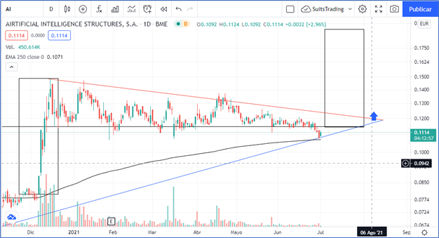Si analizamos esa tendencia alcista que se viene desarrollando en Airtificial precisamente desde el 11 de mayo de 2020, que se ha soportado el 28 de septiembre de 2020 y justamente la respeta para finales de junio, encontramos la consolidación alcista del precio la cual está dándonos un retesteo de la directriz alcista, motivo por el cual vamos a estar muy atentos a lo que significa desde el punto de vista técnico ese triple piso que confluye con la línea de tendencia que al mismo tiempo ha dejado de anticipado una formación a modo de bandera o banderín con suficiente asta que nos permitiría hacer un cálculo promedio de visitar el precio según el avance a niveles del 0.1920 euros por acción en la compra permitiéndonos ese 60% de rentabilidad.
