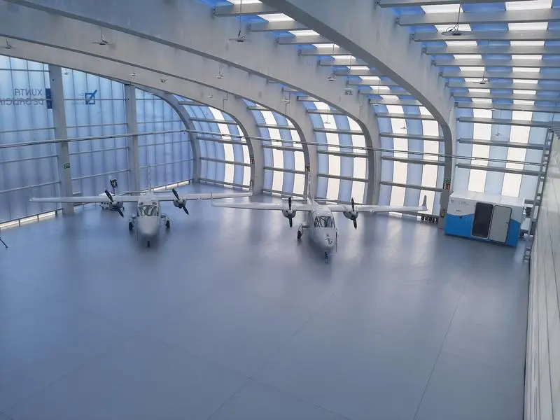 Indra se instaló compartiendo primero hangar con el Instituto de Técnica Aeroespacial Español (INTA), que ya se encontraba allí, y termino el proyecto levantando un hangar propio de grandes dimensiones y diseño futurista completamente nuevo.
