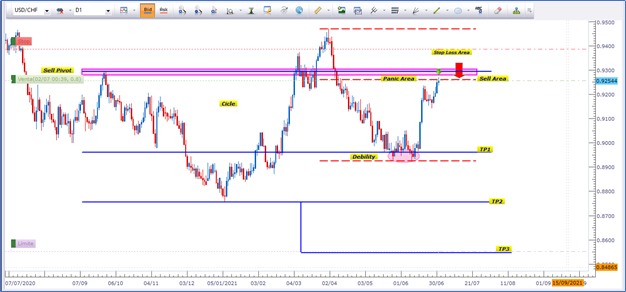 Posterior a ese trabajo, el precio hace ese movimiento de subida parabólica con la fuerza institucional a buscar precisamente esos niveles que tenemos marcados de Sell Pívot que confluyen al mismo tiempo con un área de regularidad inversa marcada como área de pánico la cual nos indican la alta probabilidad de que el precio de la paridad, USDCHF se va a caer de manera contundente.