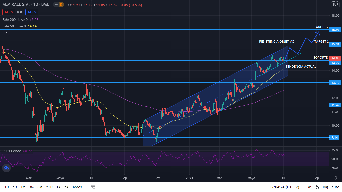 A nivel técnico, desde la caída se sus acciones por la pandemia, Almirall se situó en los 9 euros por acción y, tan solo un mes después, se encontraba en los 11 euros por acción. En ese momento salió al Ibex 35 y cayó nuevamente a los 9 euros por acción. En noviembre de dicho año recuperó los 11 euros por acción, donde comenzó una tendencia alcista llevándole a alcanzar los actualmente 14 euros por acción. En gráfico diario, de continuar la tendencia actual, Almirall iría a buscar los 16 euros por acción. En un corto plazo, si no pierde el soporte de los 14.72, para un medio plazo se saturaría el precio en la resistencia 15.91, donde de no ser perforada, el precio volvería a la línea de tendencia actual para después colocarse en los 16 euros por acción. De continuar la tendencia alcista, para el mes de agosto a septiembre el precio podría situarse por encima de los 17 euros por acción como se representa en la imagen.