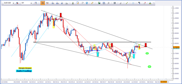 Ahora bien, repito, como a gráfico pasado, todos somos expertos, lo que nos queda por decir es que desde el punto de vista técnico en gráfico mensual para la paridad AUDUSD vamos a estar buscando posición de ventas siempre y cuando el precio retestee la última resistencia que tenemos allí trazada en niveles de 0.7600 y que al mismo tiempo, con fluya con el respeto de la directriz bajista marcada para el gráfico mensual de color negro que por supuesto al mismo tiempo deberá confluir con el respeto del área de la resistencia de la que hablábamos inicialmente marcada con esa línea negra.