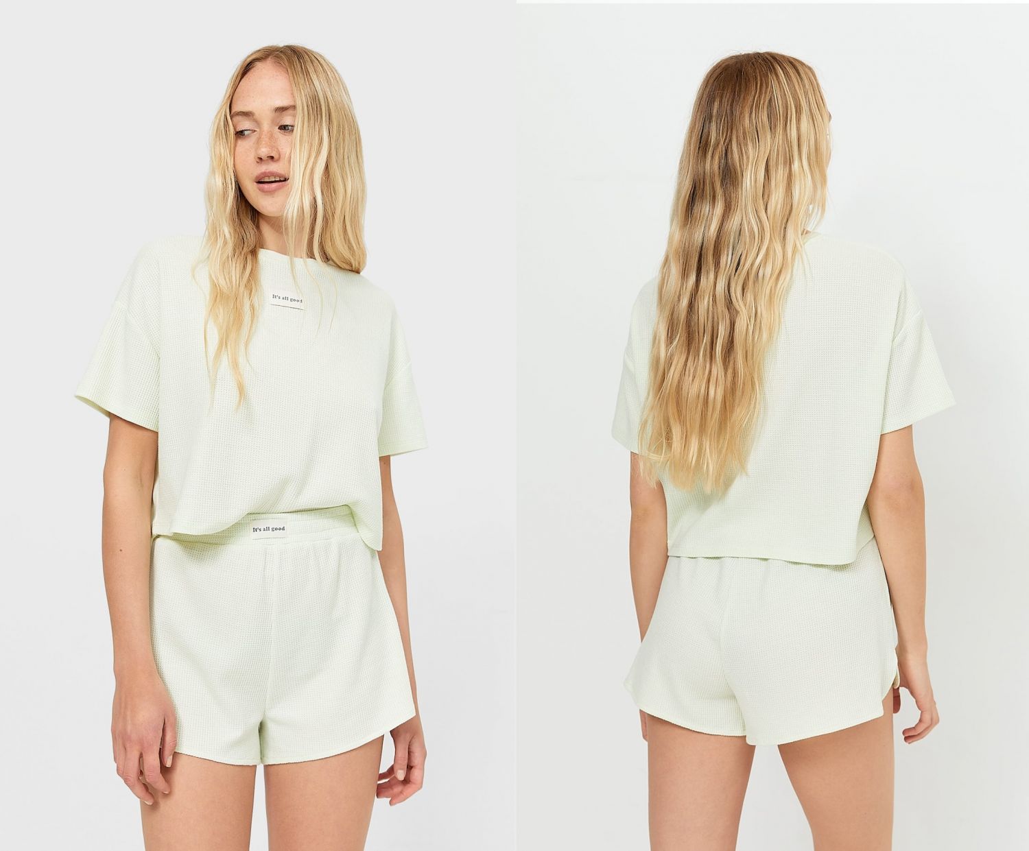 Stradivarius también cuenta con este conjunto de pijama compuesto por dos piezas a 5.99€ disponible en varias tallas y en este tono agua marina. El short tiene un 40% de descuento y lo mismo para la camiseta a juego.
