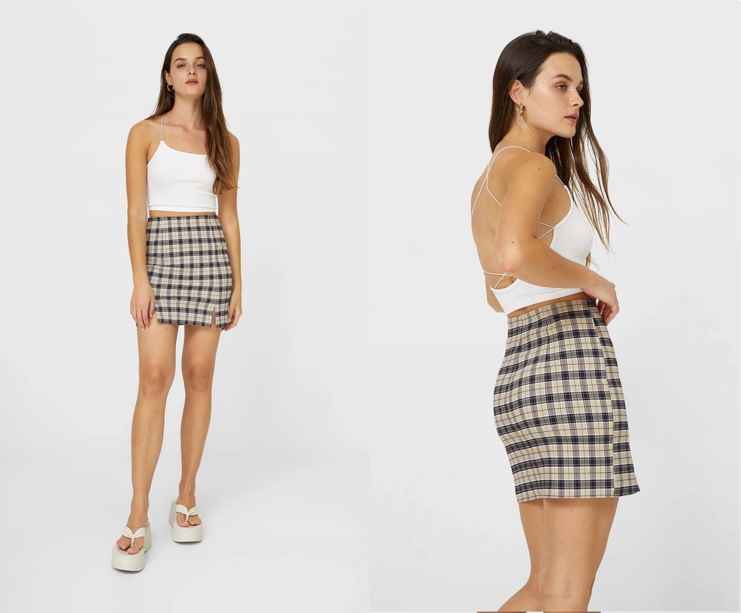 Por último, Stradivarius también cuenta con esta falda mini corte disponible en varias tallas y dos acabados diferentes a cuadros: el naranja de la imagen y el rosa pastel. Todos ellos por 5.99€, ya que está rebajada un 63%.