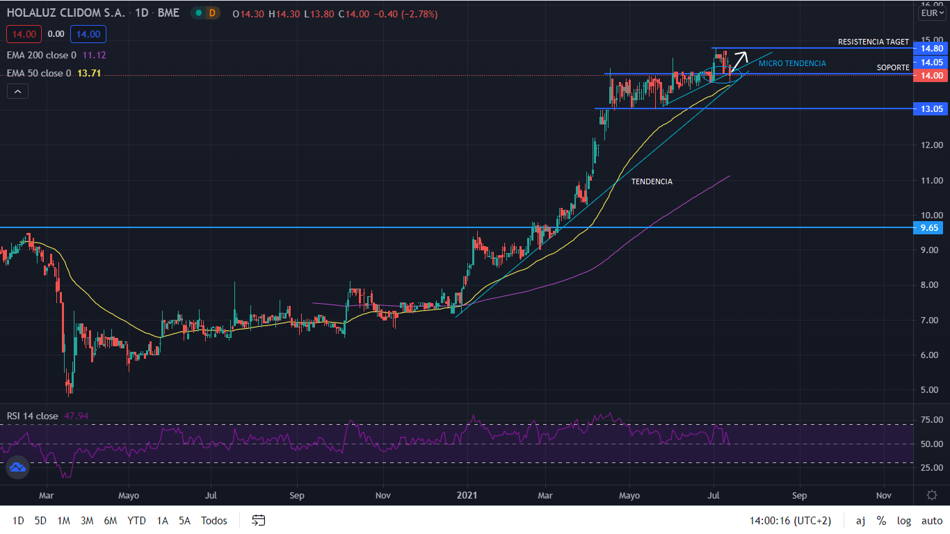 A nivel técnico, desde su salida a bolsa en noviembre del 2019, Holaluz se encontró cuatro meses después con la situación de la pandemia que le llevó a perder el 50% del valor de sus acciones, situándolo en los 4,80 euros por acción. A pesar de dicha situación, desde el mínimo de marzo, su recuperación fue constante, hasta que en diciembre de 2020 había recuperado su punto anterior a la pandemia. Desde ese momento, su situación ha sido de crecimiento, llevando el precio los 14,30 euros por acción, máximos históricos en los que se encuentra a día de hoy. Actualmente, tras haber salido de una fase de acumulación lateral entre los meses de abril a junio, se encuentra formando una microtendencia alcista marcando el máximo histórico en los 14,80. Para el corto plazo, si Holaluz continua la micro tendencia y no pierde el nivel de los 14 euros por acción, en los próximos días podría ir a buscar nuevo máximo histórico, situando a Holaluz por encima de los 15 euros por acción. En conclusión, Holaluz arroja unos resultados positivos que llevarán a la compañía a seguir creciendo de forma uniforme.