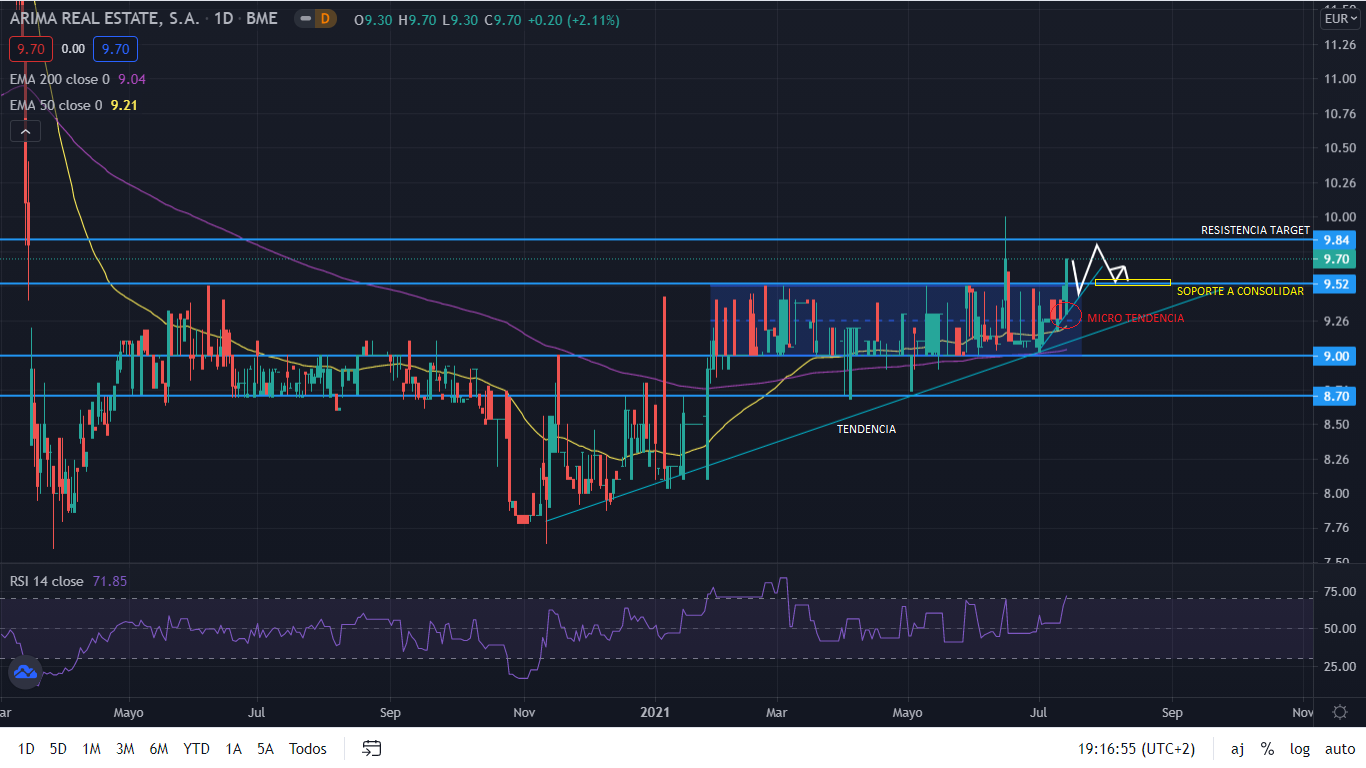 A nivel técnico, desde su salida a bolsa en 2018, Árima vio el precio de sus acciones durante el primer año sin apenas fuertes cambios. Fue en noviembre de 2019, tras cumplir un año, cuando el precio empezó una senda alcista, subiendo un 30%, pasando de los 10 a los 13 euros por acción. Desde su máximo histórico alcanzado en febrero de 2020, el precio de sus acciones empezó a bajar, hasta que en marzo del mismo año, con el inicio de la pandemia, sus acciones cayeron a mínimos históricos situándose en los 7,50 euros por acción. Desde dicho mínimo, el precio se ha ido recuperado hasta situarse hoy en los 9,70 euros por acción. Actualmente, en gráfico diario, su tendencia principal es alcista y, desde el inicio de este año, se ha situado en un canal lateral donde el pasado día 1 de julio ha iniciado una formación de microtendencia alcista que ha perforado el actual canal. De consolidar el nivel 9,52 como soporte, en el corto plazo, Árima iniciaría un nuevo canal entre los niveles 9,52 y los 9,84. De seguir con la tendencia principal, para el ultimo trimestre de este año, su precio se situaría por encima de los 10 euros por acción.
