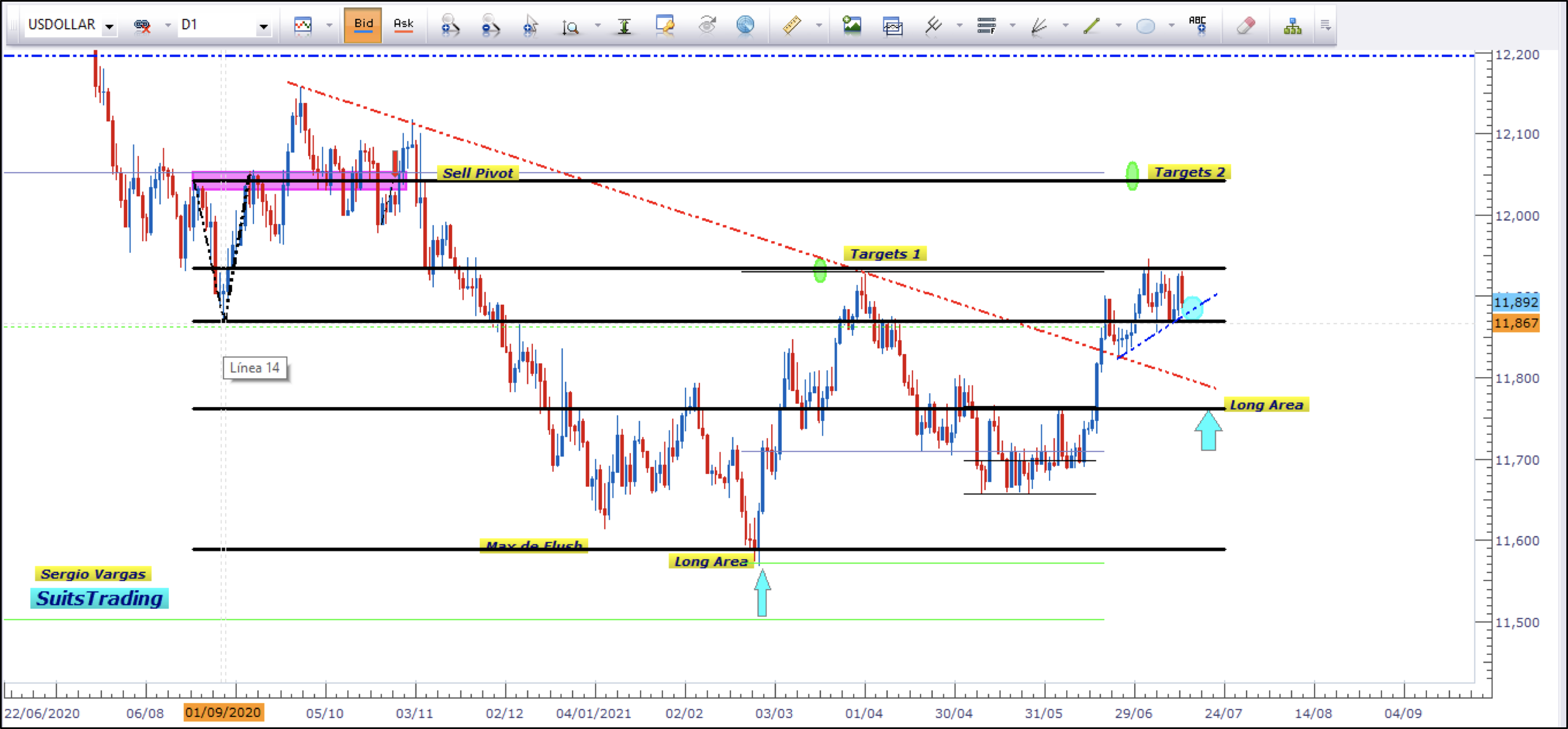 No obstante, para que eso sucediera tendríamos que identificar claramente una ruptura contundente de la última tendencia alcista que se ha creado desde el 23 de junio de 2021 hasta la fecha, la cual confluye con una línea de soporte institucional en niveles de 11.869 CFD o 92,08 futuro correspondiente al vértice del cierre de ciclo creado para septiembre del año 2020. Esto técnicamente significa que el precio de llegar nuevamente a esos niveles y respetarlo, muy seguramente tomará impulso para ir a pagar los segundos targets que allí presentamos en 12.040 dólares CFD o 93,92 Futuro.