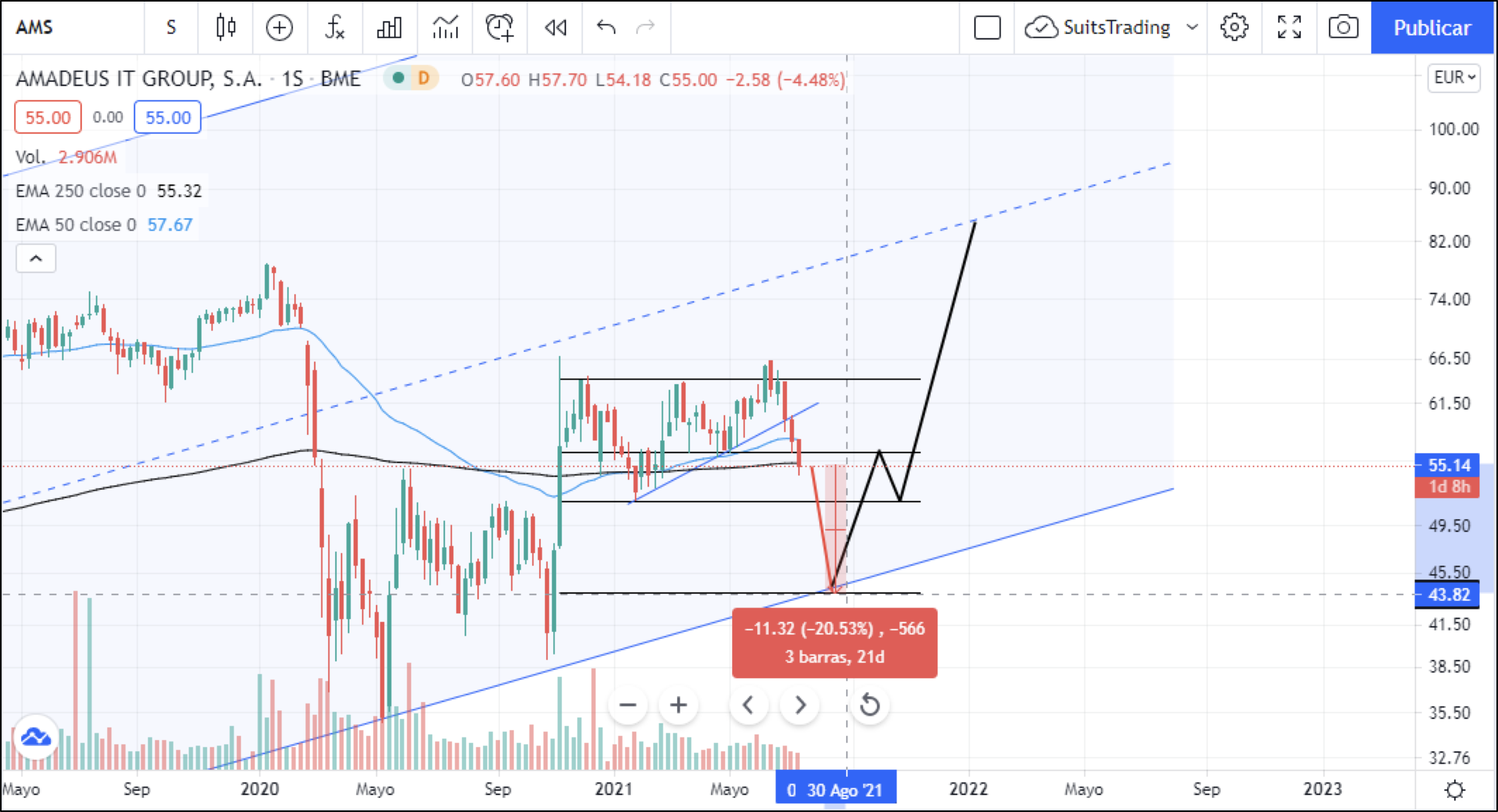 Técnicamente, el gráfico semanal de Amadeus refleja un comportamiento lateral desde el 30 de noviembre de 2020 hasta la fecha, el cual genera la ruptura de una última tendencia micro alcista, la cual nos haría ir a favor de las intenciones de Barclays, pero en este caso buscando un nivel de 44 euros por acción. Esto representa aproximadamente un 20% de rentabilidad para posiciones en corto de acuerdo con Barclays, eso sí, vigilando que el cierre de vela semanal realice la ruptura de la EMA de 250 periodos al igual que lo hizo con la EMA de 50 periodos.