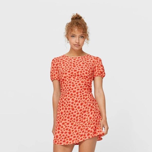 Nos referimos a un vestido corto cuya falda tiene un ligero vuelo. Cuenta con un precioso estampado de flores en color rojo que destaca sobre el fondo, que es de un tono ligeramente más claro. Tiene el cuello redondo y un bajo acaba en un volante. La manga es corta y abullonada, siguiendo una de las tendencias estrella de la temporada. Además, te gustará su espalda, quizá el detalle favorito de esta prenda. Queda totalmente descubierta y, en la parte superior, cuenta con una lazada con el mismo estampado que el vestido. Su precio es de 17,99 euros.