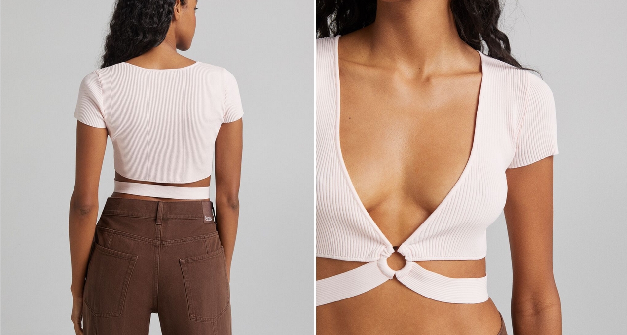 Si te gusta lo diferente, este jersey de manga corta con arandela de Bershka es de lo más extremo. Una mezcla entre esta prenda clásica y un top que hará que todos centren su mirada en él este verano. Disponible en varias tallas y en dos acabados diferentes (rosa claro y marrón), por solo 15,99€.