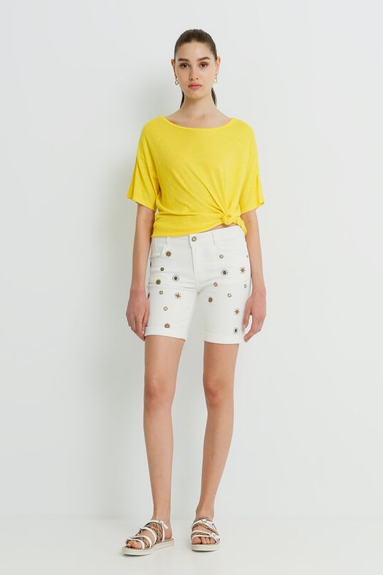 Para moldear tu figura, viene en tiro medio, de corte corto estilo bermuda, tejido de algodón con punto de elastano. Cinco elegantes bolsillos y cierre de cremallera y con un delicado botón metálico, para usarlo en este verano en la ocasión que desees y muy fácil de combinar. Destaca tu figura con este pantalón, lo traen en dos colores, azul y blanco, en tallas desde la 24 a la 34 a un precio de 41.97 euros en cualquier tienda de Desigual.
