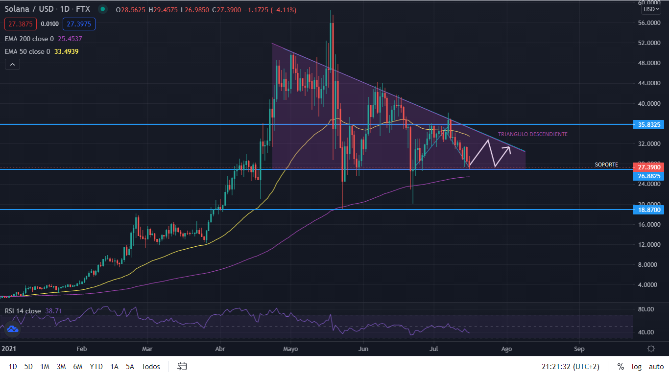 A nivel técnico, en la salida de SOL, la criptomoneda de Solana en 2020, su precio era de 0,80 USD. Al inicio de del año 2021, con el fuerte crecimiento de las criptomonedas, vio su precio crecer hasta los 58 USD; un crecimiento cerca al 2.900% en 3 meses. Desde el pasado mes de mayo, en gráfico diario, se encuentra formando un triángulo decreciente (ya que no está perfectamente dibujada la figura charlista, pierde cierta validez). En un primer escenario, al finalizar la formación de dicha figura, nos daría un nuevo impulso alcista. Para el corto plazo, SOL de continuar respetando el soporte de los 26,88 USD, lo veríamos ir a buscar la parte superior de la formación. Si al llegar a la línea decreciente del triángulo, el precio la respeta, continuaríamos dentro de la figura. Para un escenario alternativo, si SOL respeta el soporte anterior mencionado y llega a la línea decreciente del triángulo, perforándola, iría a buscar la resistencia 35,83, de forma que el triángulo se invalidaría.