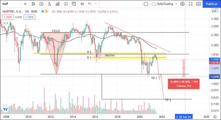 Técnicamente en grafico mensual, el precio de la acción de Mapfre ha dejado en esas áreas laterales un cierre de ciclo con debilidad que comienza su caída justo para la pandemia y que luego de ir a buscar los mínimos de ese ciclo para octubre del 2020 en niveles de 1,28 euros por acción intenta subir.