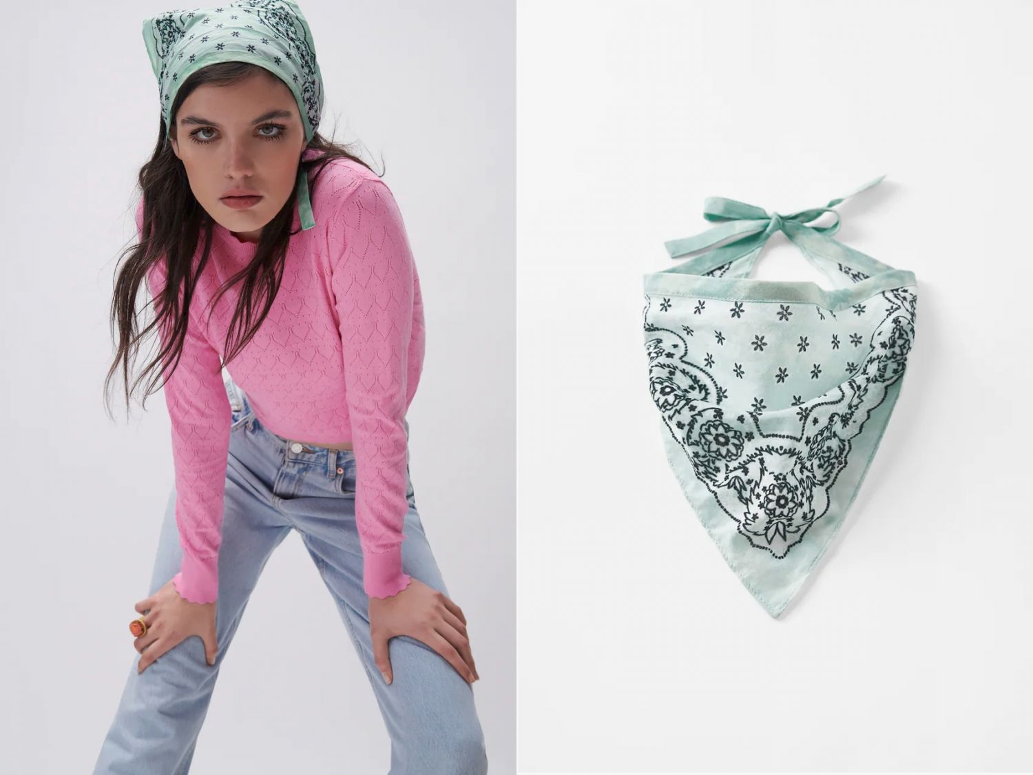 Otro complemento para el pelo es esta bandana triangular de Zara. También ha sido rebajada un 45% para que la puedas adquirir por solo 3,99€. Se encuentra disponible en talla única, pero hay varios colores para elegir: verde claro (como el de la imagen), y el de estampado naranja. Ambos pueden combinar muy bien con varios estilos juveniles.