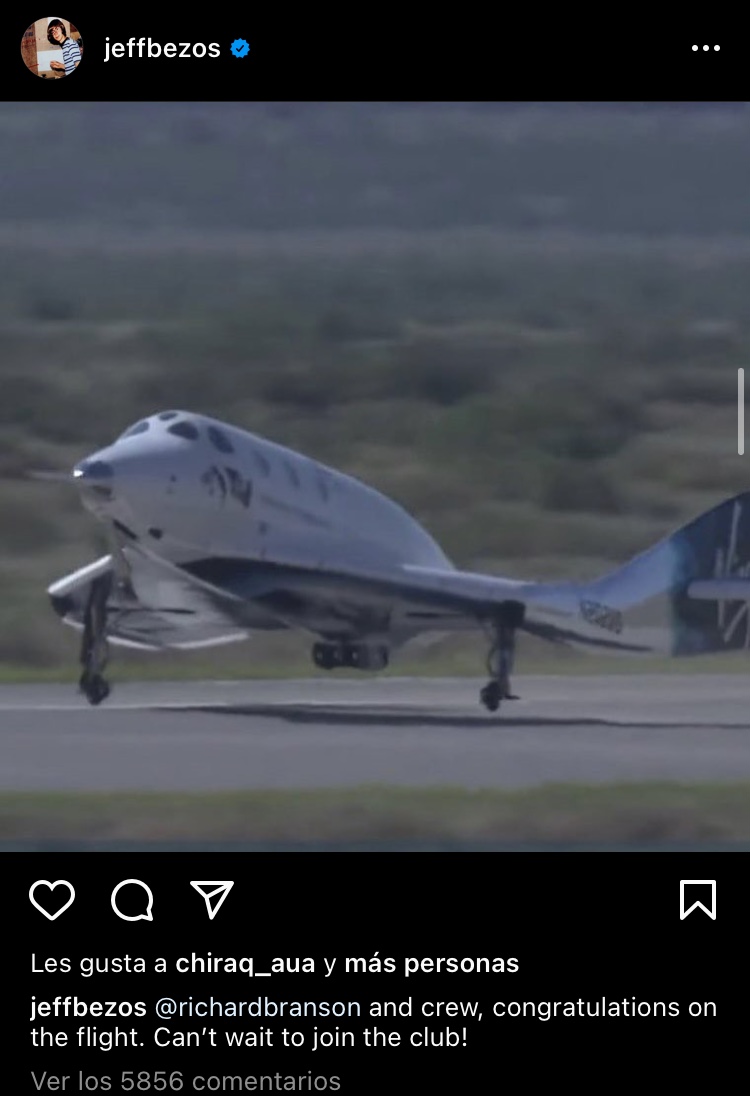 Nueve días después del viaje de Richard Branson y Virgin Galactic, le ha llegado el turno a Jeff Bezos, quien se ha convertido en el segundo millonario en viajar al espacio a bordo del cohete New Shepard, volando más alto que Branson, a una altura de más de 100 kilómetros. El creador de la mayor empresa de venta al detalle del mundo quiso recalcar que los de Virgin Galactic no son exactamente aviones espaciales, ya que no llegaron a superar los 99,7 km de la línea imaginaria de Kármán, abriendo el debate de quien de los dos ha llegado primero al espacio. Sin embargo, calmó las posibles diferencias que puedan existir entre ellos felicitando al británico vía Instagram.