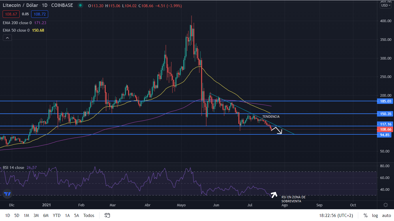 Sin embargo, no lo pudo batir, pues en mayo de este año, con la caída de todas la criptomonedas, LTC nuevamente cayó hasta situarse hoy en los 100 dólares, una caída del 75%. LTC es un ejemplo de la gran volatilidad de las criptomonedas y de que se pueden tener grandes ganancias o grandes pérdidas. Actualmente, LTC está perforando el soporte de los 117, lo que le llevará en el corto plazo a perder los 100 dólares. Con el RSI como referencia, LTC volvería a tocar el nivel 117 junto con la línea de tendencia, antes de dirigirse a su siguiente soporte en los 94,85.