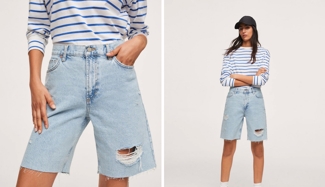 Si te gustan las bermudas con estilo, puedes comprar estas de Mango, con bajo deshilachado y roturas. Por 25,99€ tienes todas las tallas y en tres colores para elegir: azul claro como el de la imagen, crudo y fucsia.