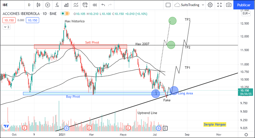 Técnicamente, la acción de Iberdrola se encuentra visitando niveles promedios a los 10 euros por acción, niveles que comentábamos para el 25 de junio de 2021 a través de Inversión.es en el artículo Iberdrola, no comprar hasta que llegue al nivel de 10 euros. El precio de la acción de Iberdrola ha llegado a las áreas mencionadas y marcadas como buy pívot, precio y zona donde sería interesante fundar compras para buscar sus máximos anteriores de enero del 2021.
