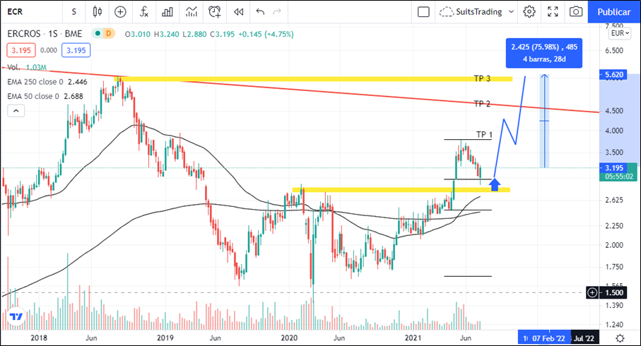 El próximo 28 de julio Ercros presentará cuentas ante el mercado. Unos resultados que muy probablemente impulsaran el precio de la acción hasta máximos de 2021 en 3,78 euros. La compañía se desarrolla en el sector químico, de los adobos, tratamiento de sal y muchos más, ha presentado un gran impulso positivo posterior a la pandemia, incluso el precio actual de la acción se encuentra en más del 100% de rentabilidad desde que tocó los mínimos el 27 de abril de 2020 en niveles de 1,41 euros por acción.