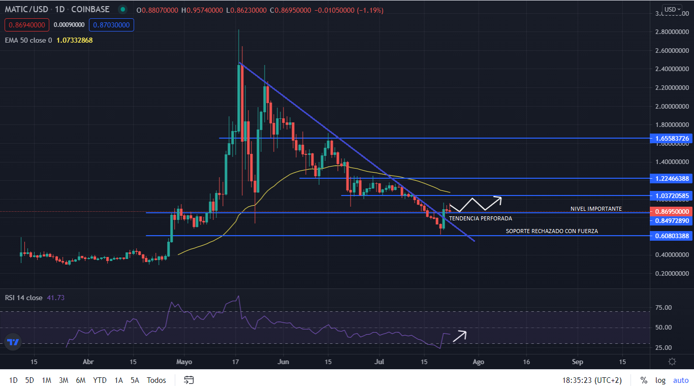Actualmente MATIC tras alcanzar el soporte 0,60, lo ha rechazado con fuerza, posicionándose en el siguiente nivel 0,86 USD. Para el corto plazo, tras haber perforado la línea de tendencia de los últimos meses, si MATIC no pierde el actual nivel, podríamos ver una formación lateral como fase de acumulación, antes de iniciar un movimiento a alcista para alcanzar el 1 USD. De lo contrario en un escenario bajista, si pierde el actual nivel, MATIC podría continuar bajista hacia el nivel 0,60 USD nuevamente, donde la reacción en dicho soporte seria determinante para su siguiente dirección en el precio a medio plazo.