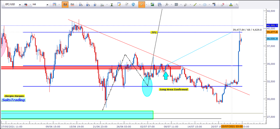 Lo que queda en adelante es entonces, primero confirmar que el precio de cierre de la vela diaria esté siempre por encima de los 34.700 dólares, área donde estaba ubicada la resistencia en cuadro rojo que confluyen con área de regularidad. Adicional a ello, se debe confirmar que el cierre de la vela diaria sea sólido para que muestre una fuerza real alcista que vaya acompañada de su capitalización bursátil.