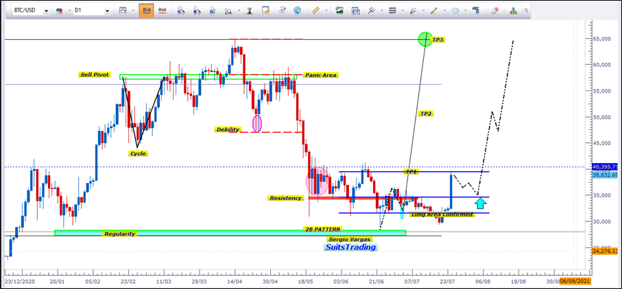 Es aquí donde los analistas técnicos toman valor. Si bien es cierto que los entes de control pueden perjudicar fuertemente el desarrollo de estos activos, también es cierto que, de cara a inversionistas, simplemente es una oportunidad de generar dinero. Es allí donde, desde el punto de vista técnico, se muestra desde el 8 de julio, áreas en las que sería recomendable operaciones de compra con un primer objetivo en los niveles cercanos a los 40.000 dólares, objetivos que ya cumplió.