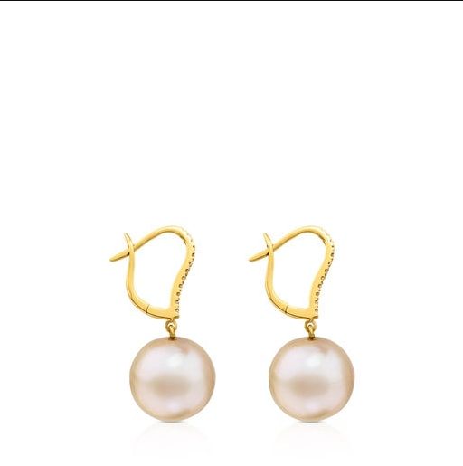 Los pendientes ATELIER TOUS ROSA ORIOL Novias, elaborados en oro amarillo de 18 Kt y dos fastuosa perlas que le dan aún más vida, estas cultivadas en agua dulce, de un tamaño entre 1 y 1.2 cm, con delicados ganchos engastados en delicados diamantes de talla de brillante de 0.11 ct H/SL, un largo ideal para que luzcan en tus orejas de 2.4 cm y cierre de gancho. Su coste 700 euros.