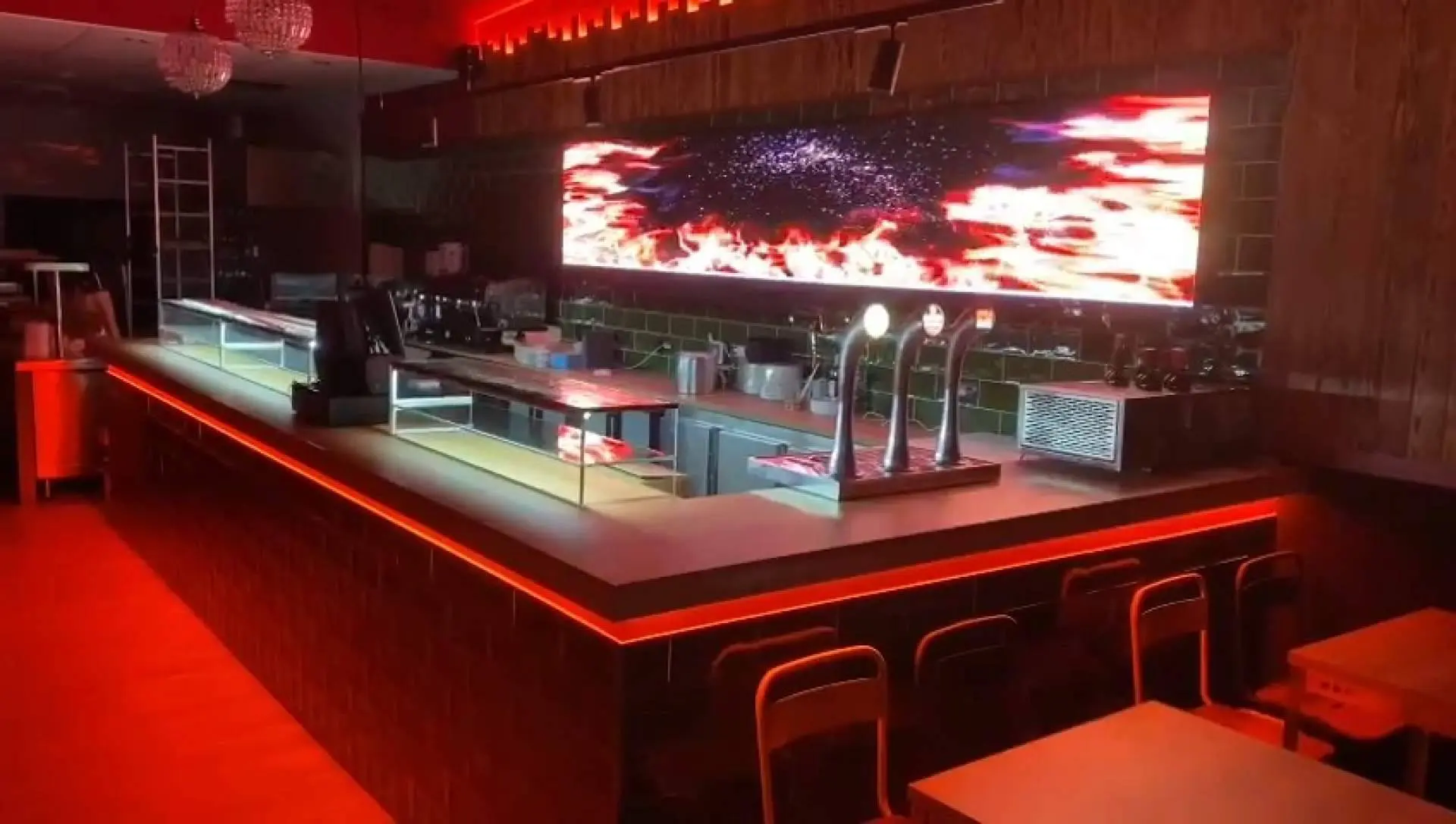 La pantalla muestra efectos de fuego y humo para adaptarse a la experiencia que ofrece el local a sus clientes. Todo va en perfecta combinación con el estilo y crea una vivencia única a todo el que acude.