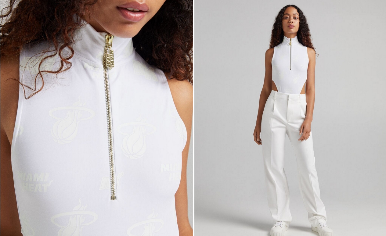 Si te gusta este tipo de prendas, entonces Bershka tiene un body exclusivo de la NBA para ti. Se trata de este modelo disponible en color blanco con detalles de estampados de símbolos del baloncesto y en varias tallas por 22,99€.