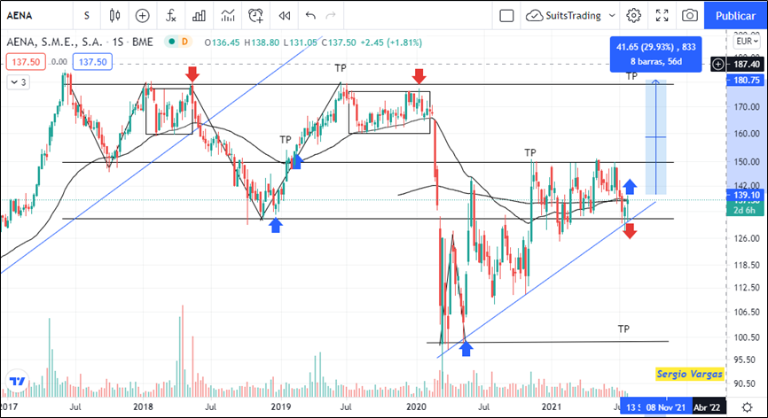 Es entonces, que desde esos mínimos buscamos movimientos al alza apoyados de la nueva directriz alcista la cual nos llevará al precio objetivo ubicado en 180 euros por acción, niveles previos a la pandemia y que confluyen con el pago del patrón dibujado dando desde la zona actual un 30% de rentabilidad aproximada. Para el cierre de vela semanal, el precio realice la ruptura de ambas medias móviles exponenciales y cerrando por encima de las medias móviles estaríamos en posición de compra.