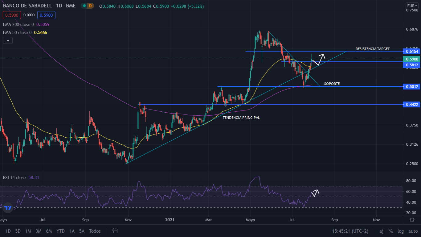 A nivel técnico, desde su máximo en 2007, su tendencia ha sido bajista en gráfico mensual. Tras perder el euro por acción en enero de 2020, su situación empeoró por la situación de la pandemia colocando sus acciones en 0.24 euros por acción, lo que sería su mínimo histórico. Desde dicho mínimo en noviembre del 2020, Sabadell se encuentra en una tendencia alcista, que el pasado 19 de julio se vio perforada, y el precio fue al soporte 0,5012, donde fue rechazado a alcista y posteriormente se reincorporó a la tendencia.