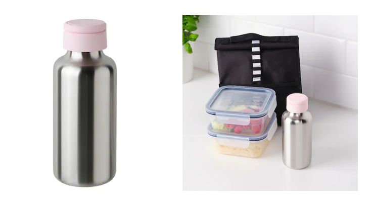 Ikea trae para toda la familia esta botella de agua, en acero inoxidable, con capacidad de medio litro, en un color rosa claro, confeccionada con materiales para tener una larga durabilidad y por la forma que fue diseñada será muy cómoda para llevarla contigo.